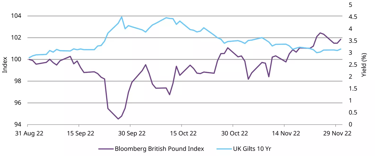 Bloomberg British Pound index and 10yr UK Gilt yield*