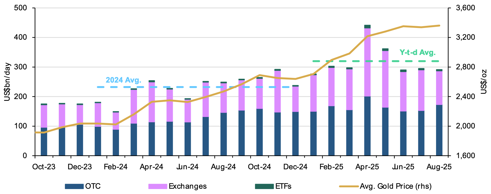 Gold market trading volumes remained broadly unchanged, averaging US$290bn per day – just 2% lower m/m.5 The minor decline was led by a 17% m/m drop in exchange-traded volumes – trading at both COMEX and Shanghai Futures Exchange cooled. Despite this, the average volume of US$114bn/day has remained above its 2024 level of US$102bn/day. Gold ETF trading volumes were also down across all regions, decreasing 9% m/m to US$4.5bn/day. But OTC trading activities rose, reaching US$171bn/day on average in the month, 12% higher than July and well above the 2024 average of US$128bn/day.