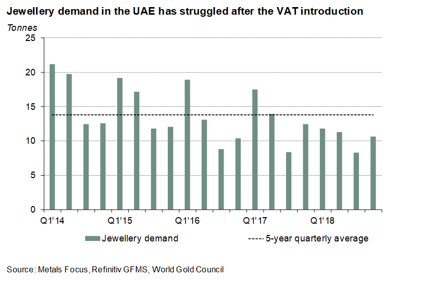 The main message is jewellery demand is still suffering because of the recent change in tax. As a reminder, the 1st January 2018 marked a significant change for consumers in the UAE: for the first time they would have to pay VAT. The 5% consumption tax was well flagged by the government. And the response in gold jewellery demand was entirely unsurprising: it perked up in Q4 2017 ahead of the tax change, before slumping once it came into effect.