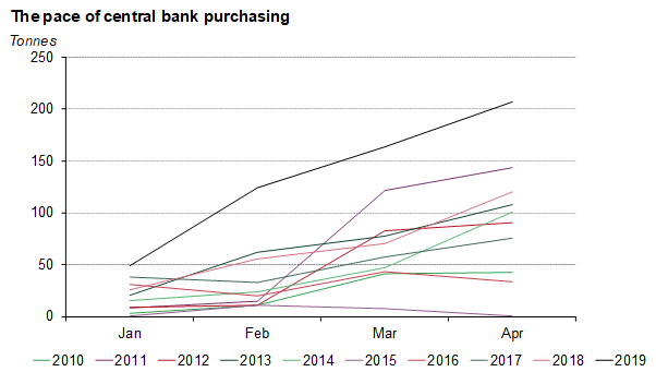 Reported net purchases for 2019 so far total 207t, the highest year-to-date total since central banks became net buyers in 2010. (And it’s not even close – see chart.) This could be viewed as a strong statement of intent towards gold, especially given this follows the highest level of annual purchases for 50 years.