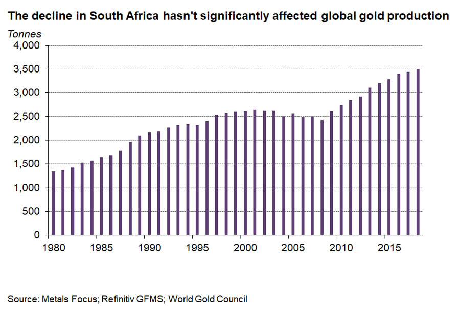 South African gold output has been declining for several decades now. From a peak of around 1,000t in 1970, the nation’s gold output fell to 130t in 2018. A combination of closure, maturing assets and industrial strife has created an inhospitable operating environment. Even the leading gold miners headquartered in South Africa are now focusing elsewhere. (Although, according to the US Geological Survey, the country still has 6,000 tonnes of gold reserves.)1