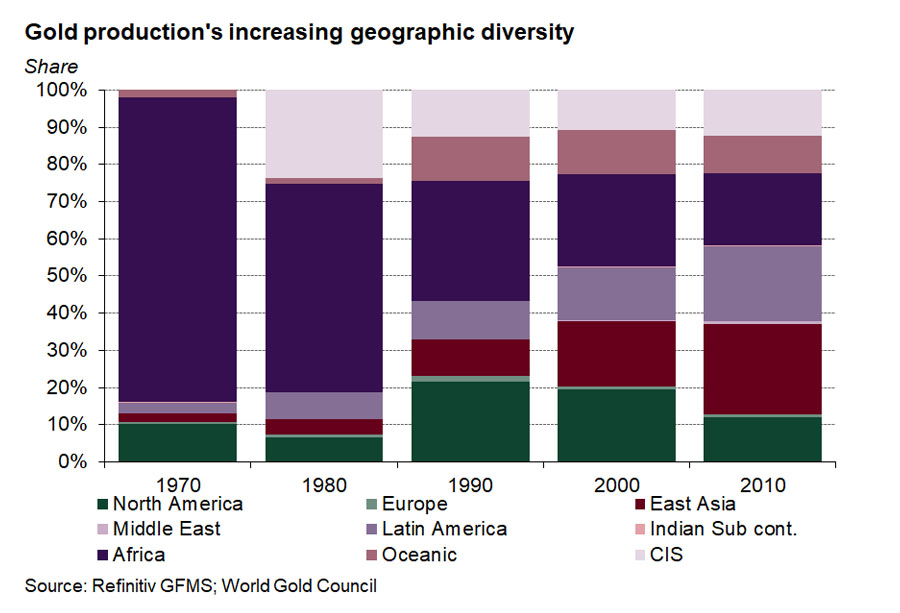 But all this reminds me of a chart we published almost a decade ago (see below).2 While the decline of South African production has been a feature of the gold market for several decades, so has the emergence of new sources of gold. Geographically-speaking, gold mine production is more diversified that ever. (Not much has changed since 2010 in terms of gold production’s geographic split.) And this is a key strength of the gold market. Given the global spread of gold mining, supply to the market is less susceptible to regional shocks and therefore far more stable than in some other metals. The top six gold producing nations only account for 45% of global gold production (compared to platinum, for example, which sources 98% of its new supply from the top five producing nations).345