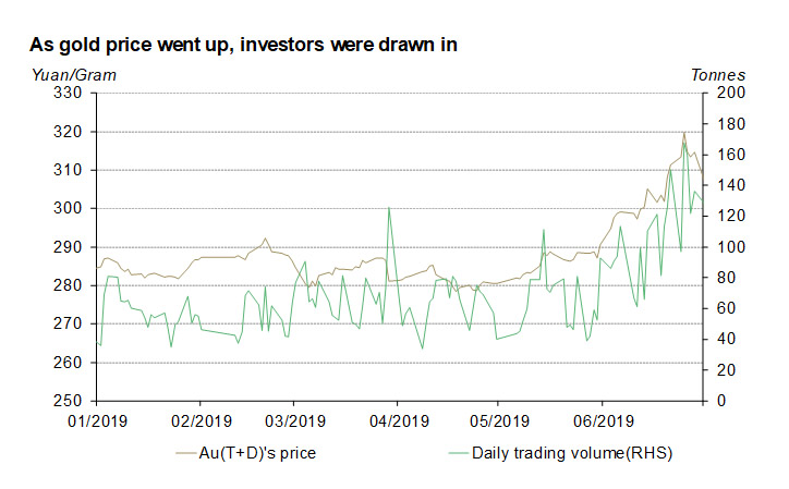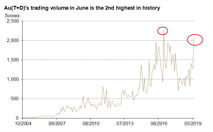 Having risen over 3% in May, the loco-China gold prices continued to soar in June. Au(T+D), the most liquid and margin-traded gold contract at Shanghai Gold Exchange, rose 8.71%, the best monthly performance in 3 years.