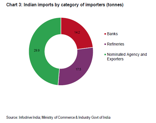 When analysing gold imports data in June, gold doré (fine gold content) imports were 28% of total imports; 17 refineries imported 17.5t of gold doré in June. Similarly, 14 banks imported 14.2t bullion in June (Chart 3). After considering Jewellery exports and round-tripping volumes, net gold imports in June was 47.6t- marginally higher than 44t y-o-y.3