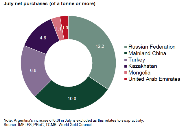 Stop me if you’ve heard this one. Looking at the list of the countries which increased their gold reserves in July, few will be surprised by who we see. Are most net purchases from a small cadre of banks? Check. Are they from emerging markets? Check. Have they been significant purchasers recently? Check.