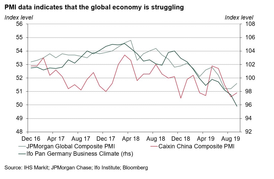 Despite efforts by governments and central banks to stimulate growth against this backdrop, several economic indicators don’t look great. The JPMorgan Global Purchasing Managers’ Index (PMI) indicates that manufacturing is already contracting (below 50), while the service sector isn’t that far behind but faring better. The Ifo Business Climate Index – close to its lowest level since the global financial crisis – suggests that the export-reliant German economy is teetering close to recession. And in China, manufacturing PMI data remains below 50.