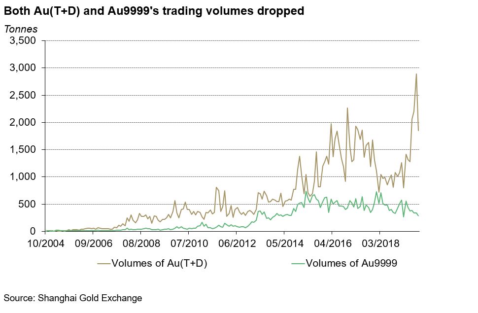 - Led by the declining gold price and the soft physical demand, both Au(T+D) and Au9999’s trading volume dropped last month while loadouts from the Shanghai Gold Exchange (SGE) levelled off.