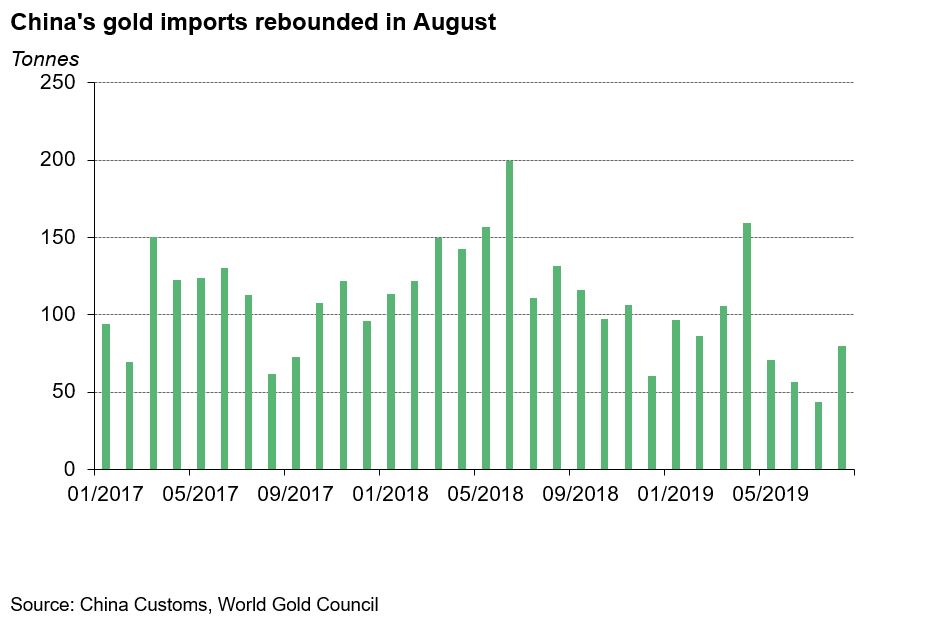 - After hitting the lowest level since 2017 in July, gold imports to China rebounded in August.