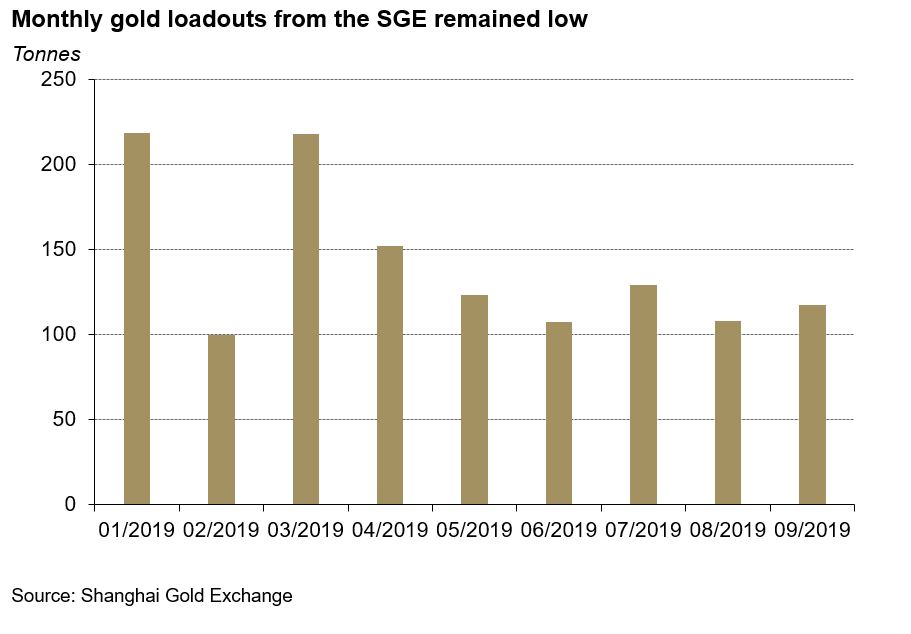 Gold withdrawals from the SGE experienced a slight increase of 9t, totalling 117t in September. While there was a marginal increase m-o-m in loadouts last month, the average loadouts during the first three quarters of 2019 is 18% lower y-o-y, also indicating a weaker physical demand this year.