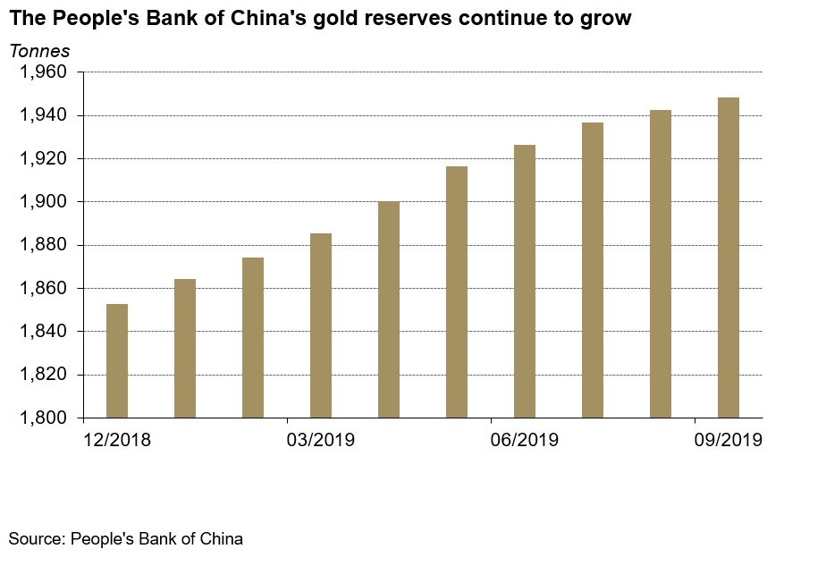 The PBoC added another 6t to its gold reserves in September. This is the 10th consecutive gold purchase and the gold reserves now stand at 1,948t at the end of September. Y-t-d, China has added 95.8t of gold to its reserves.