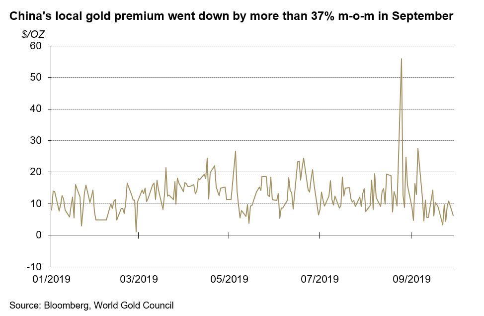 The average local gold premium witnessed a 37% fall m-o-m in September after reaching a six-year high on 26th August when USD/CNY breached CNY7 for the first time in 11 years. A more stable currency and increasing gold imports were the main reason behind the sharp fall. USD/CNY has come down from the 11-year-high of 7.19 recorded on 3rd September, amid positive signs of the US-China trade talks, easing local investors’ concerns for further depreciation. Also, China’s gold imports rebounded significantly in August after dropping for three consecutive months, increasing domestic gold supplies.2