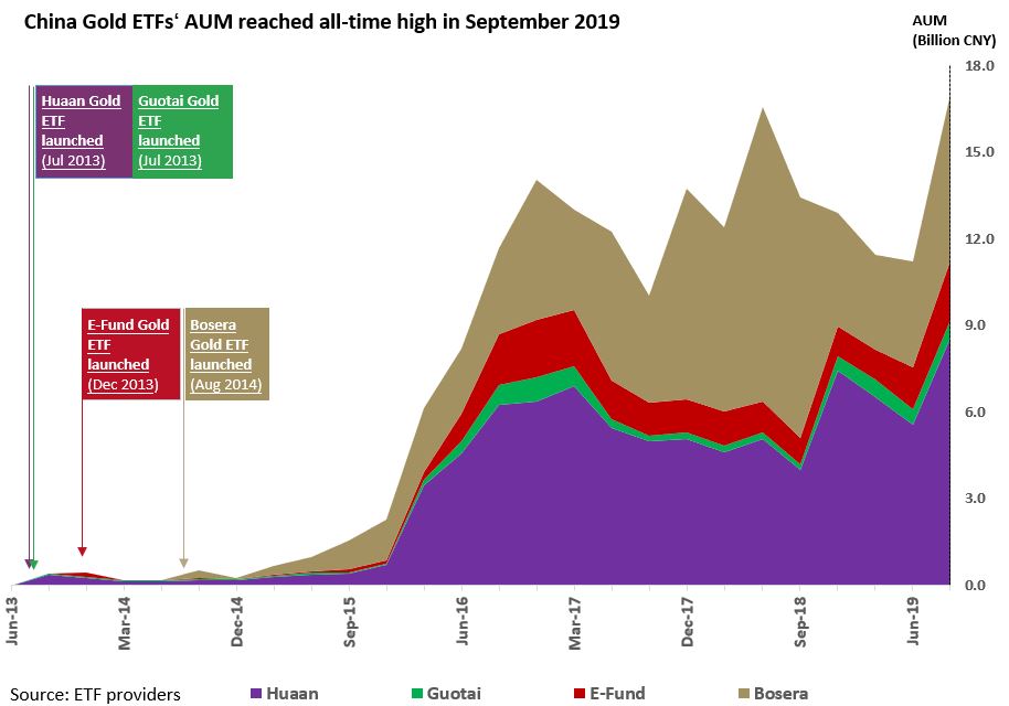 The total Asset Under Management (AUM) of Chinese gold ETFs reached 17 billion yuan or US$2.4 billion at-end September, a new all-time record. As of 30th September, holdings of China’s four gold-backed ETFs’ totalled 50t, a 3.5t rise m-o-m. The reason behind gold ETFs’ rising popularity in China could be two-fold. Firstly, Chinese gold ETF investors tend to be more sophisticated and longer-term oriented, thus treating the dip in the gold price as a great opportunity to expand their gold allocations.