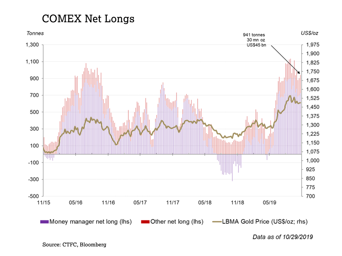 COMEX net longs rose slightly 904t to 941t for a second straight week, and remain well above the long-term averages.