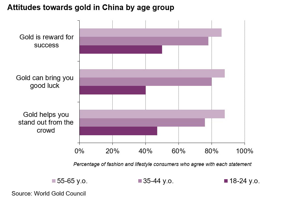 Young consumers tend to view gold differently. Our 2019 global consumer research results suggest that young Chinese consumers are less likely to believe that gold is a reward for success, or gold can bring you luck when compared with elder ones. Fashion barriers exist too: only 47% of fashion and lifestyle consumers between the ages of 18 and 24 believe gold can help them stand out from crowds, far below their elder peers. Hence, attracting young consumers – a major consuming force in the future – is challenging for Chinese jewellers.