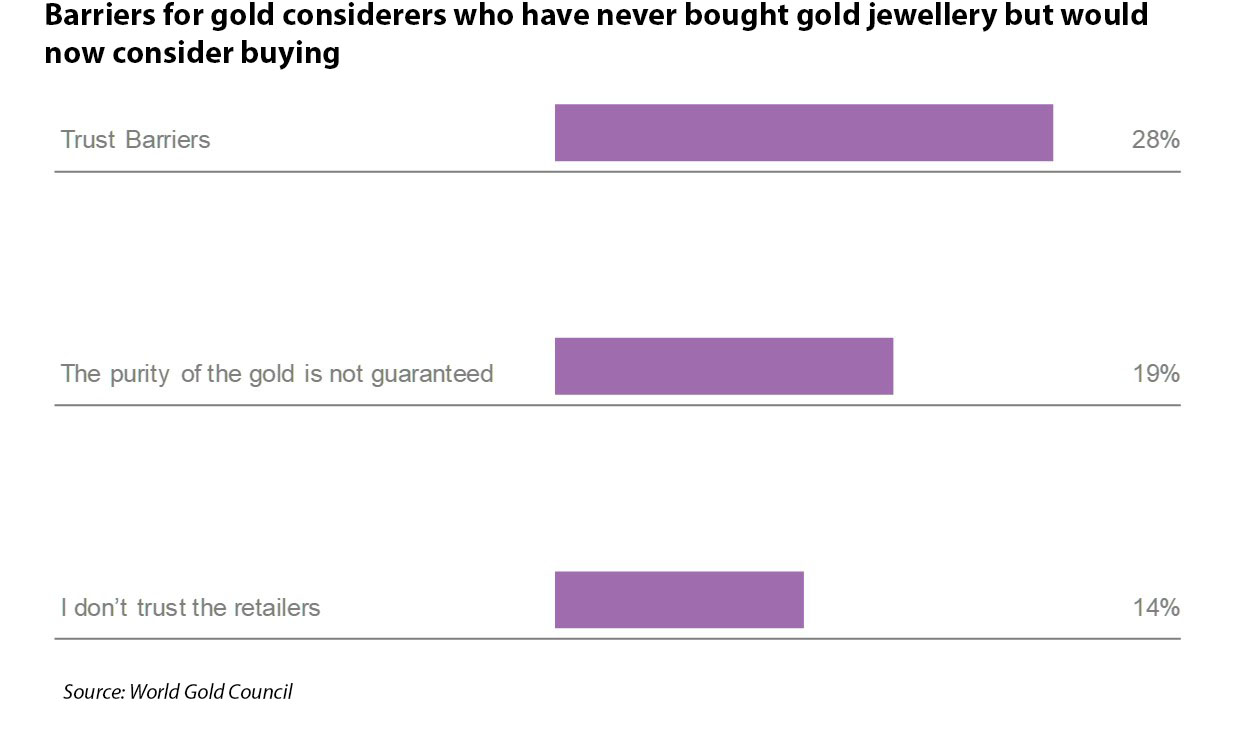 Our consumer research results also highlighted the necessity of proper jewellery market standards. While fine gold jewellery has strong global penetration, the top barrier for potential jewellery consumers – that is, people who have never bought gold jewellery before but would consider doing so in the future - is trust: 19% of potential jewellery purchasers think the purity of the gold is not guaranteed and 14% don’t trust the retailer.2
