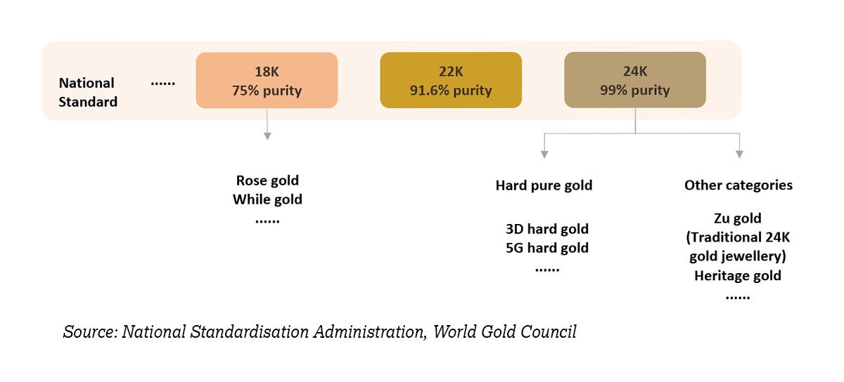 But the rapid pace of innovation can be confusing to interested observers of China’s jewellery market. To gain a clearer view, here is a basic classification sketch for traditional and innovative gold jewelleries in China. Currently, the main mandatory standard for gold jewellery in China is National Standardisation Administration’s “Jewellery – Fineness of precious metal alloys and designation 2015”. This standard categorises all gold jewellery sold in China into purity grades, that is, the minimum gold content required for each category. And it also provides fundamental information for jewellers to adhere to e.g. the required format of hallmarks on precious metals jewellery.