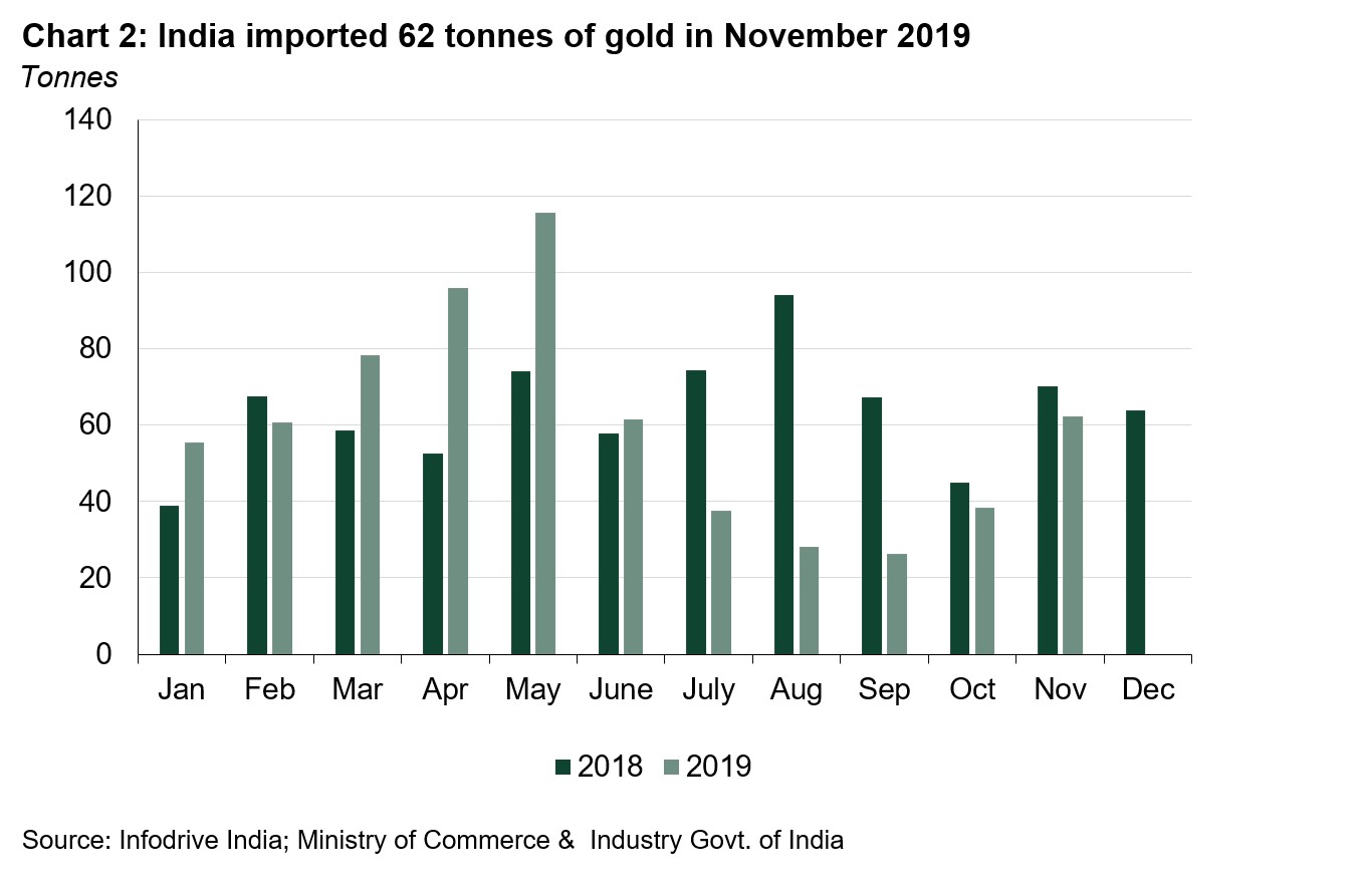 - Indian gold imports were 62.3t in October 2019 – 11% lower than the same month last year