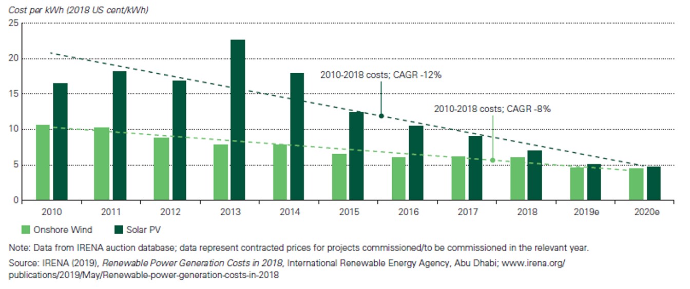 Global weighted average lifetime cost of electricity from solar PV and onshore wind, 2010-2020