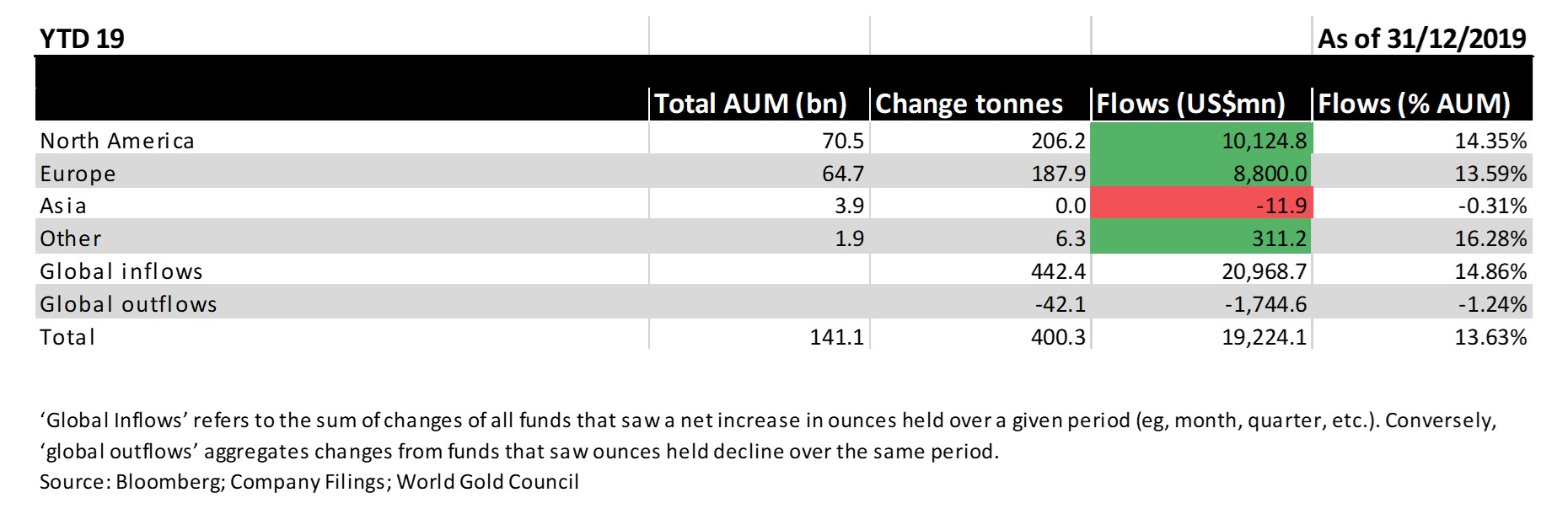 - US$19.2bn, or 400 tonnes(t), of net inflows in 2019 in almost all countries