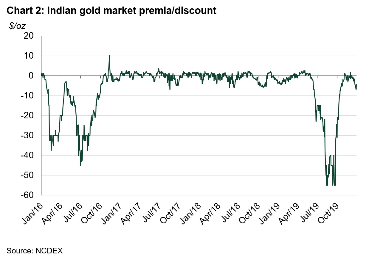 As wedding demand fell short of the expectations in November, the discount in the local market at end of November was at US$1/oz. The discount persisted in the first half of December with an average discount of US$1/oz. In absence of any weddings in the second half of the month together with start of an inauspicious period of gold purchase and higher gold price, discount in the local market widened to US$5-7/oz by end of the month with an average discount of US$4/oz in the last two weeks of December. (Chart 2).