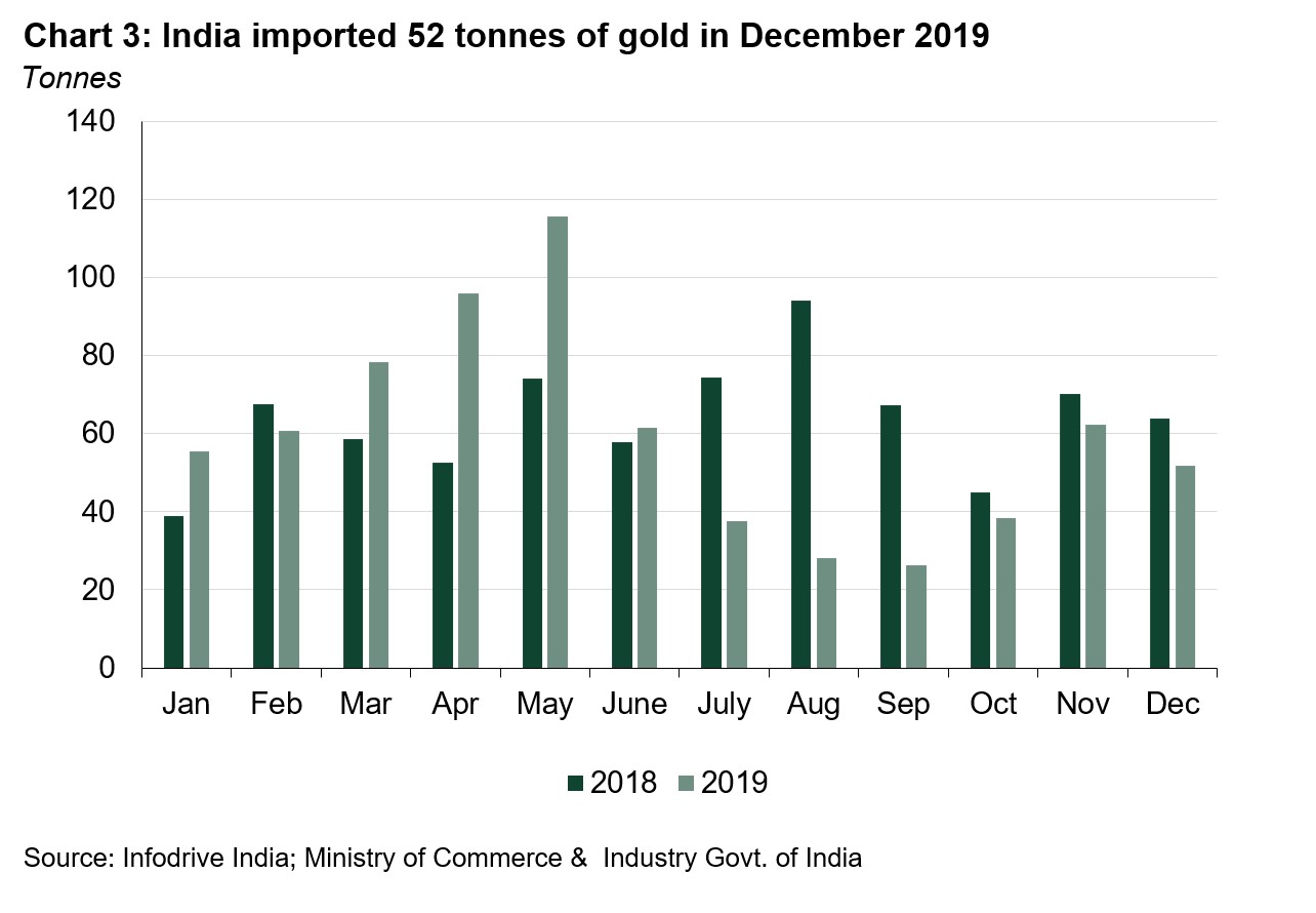 Indian gold imports totalled 51.8t in December 2019 – 19% lower y-o-y and 17% lower m-o-m (Chart 3).