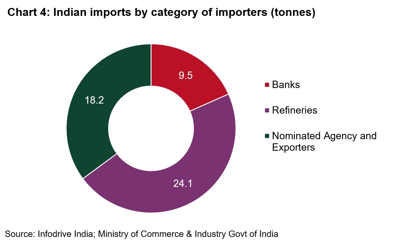Most of the bullion was sourced from Switzerland (84%) and the UAE (11%) in November. The prominent gold doré exporting countries to India were Peru, Ghana, Bolivia and USA - accounting for a combined 62% of gold doré imports in December.