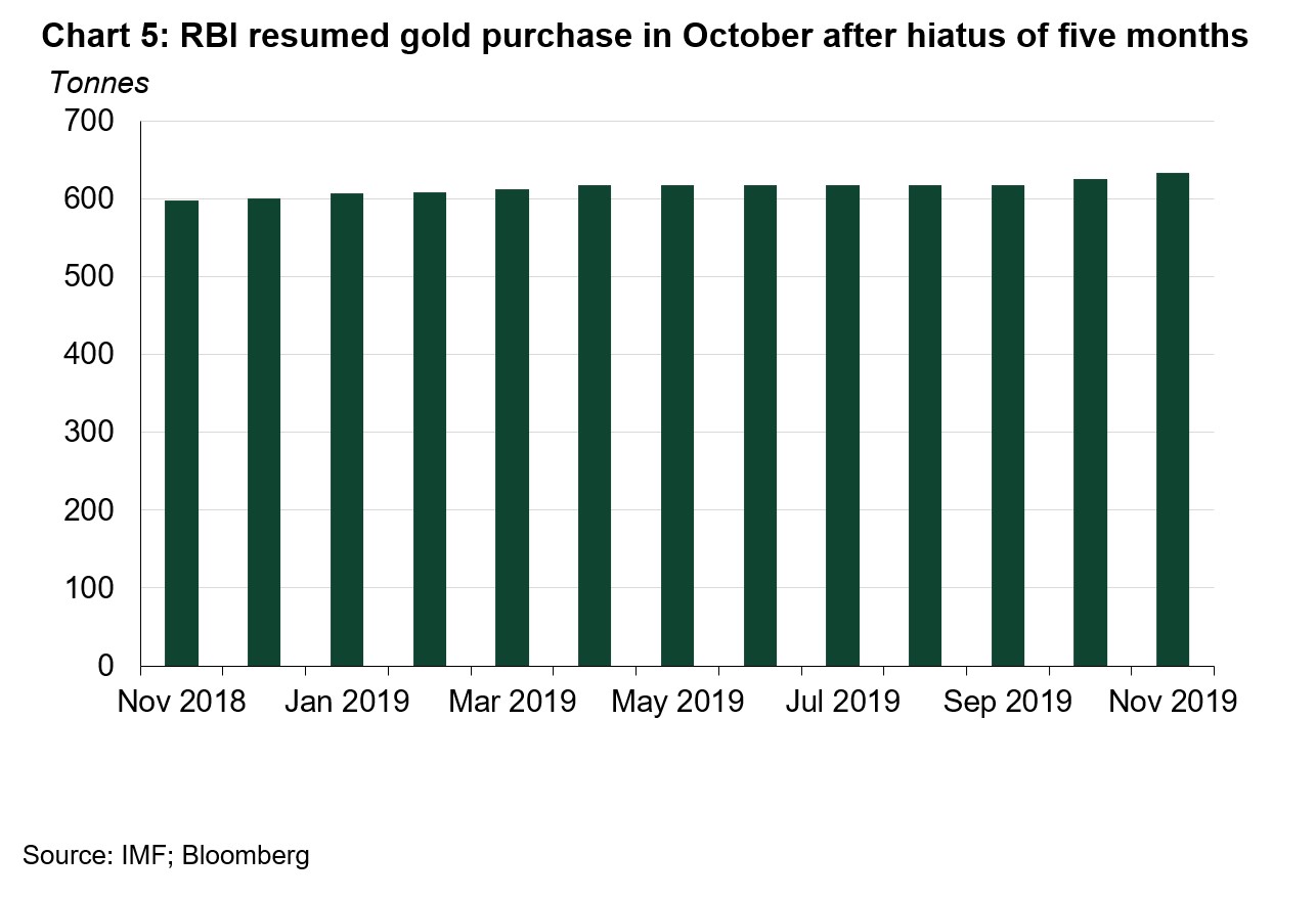 After a hiatus of five months, RBI resumed its gold purchases in October. It purchased a total of 15 tonnes of gold in October and November taking its total gold reserves to 633.1 tonnes at the end of November (Chart 5). The RBI stepped up its gold purchase to maintain safety and liquidity of its forex reserves.
