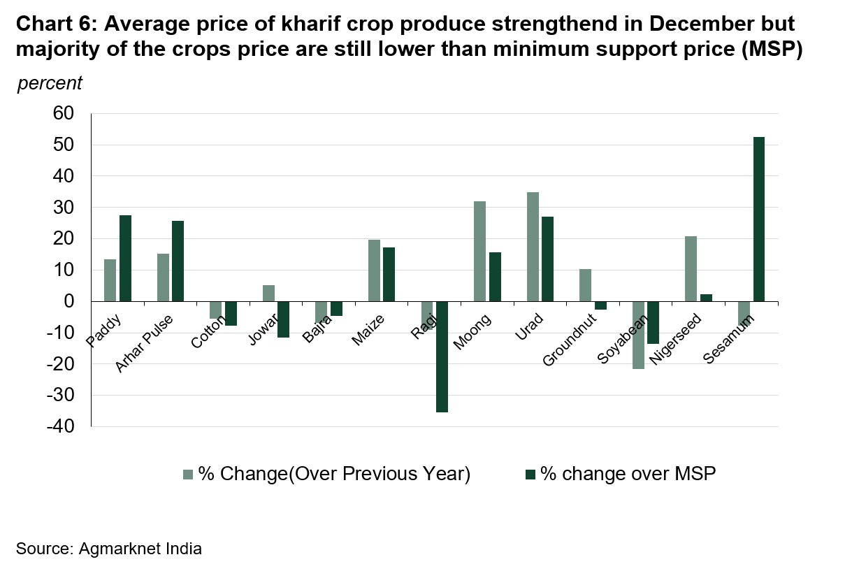 Late and heavy rainfall in the states of Madhya Pradesh, Rajasthan, Gujarat, Uttar Pradesh and Maharashtra damaged standing kharif crops. The mandi price of kharif crops which arrived in December strengthened however six of the thirteen kharif crops were trading at price lower than MSP (Chart 6).