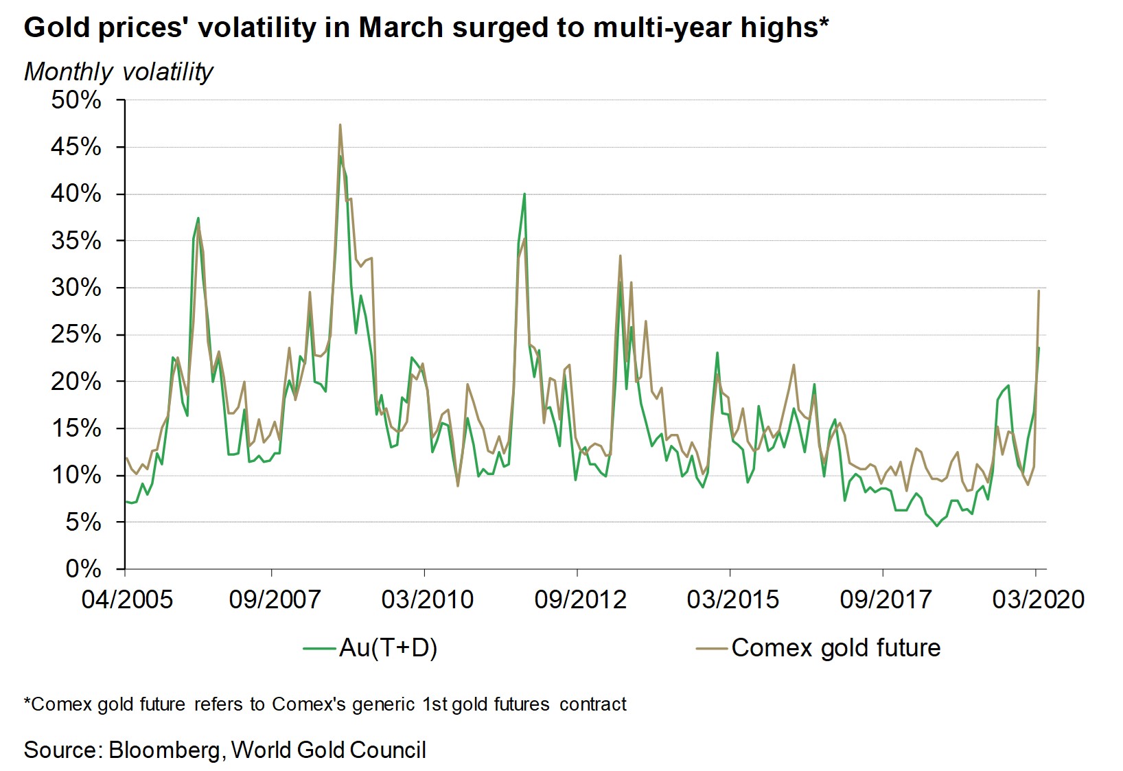 Both RMB and USD gold price volatility soared to multi-year highs in March. As we noted in our recent Investment Update: Gold prices swing as markets sell off, many investors sold liquid and return-generating assets such as gold last month, in order to meet capital requirements when risk assets sold off sharply around the globe.