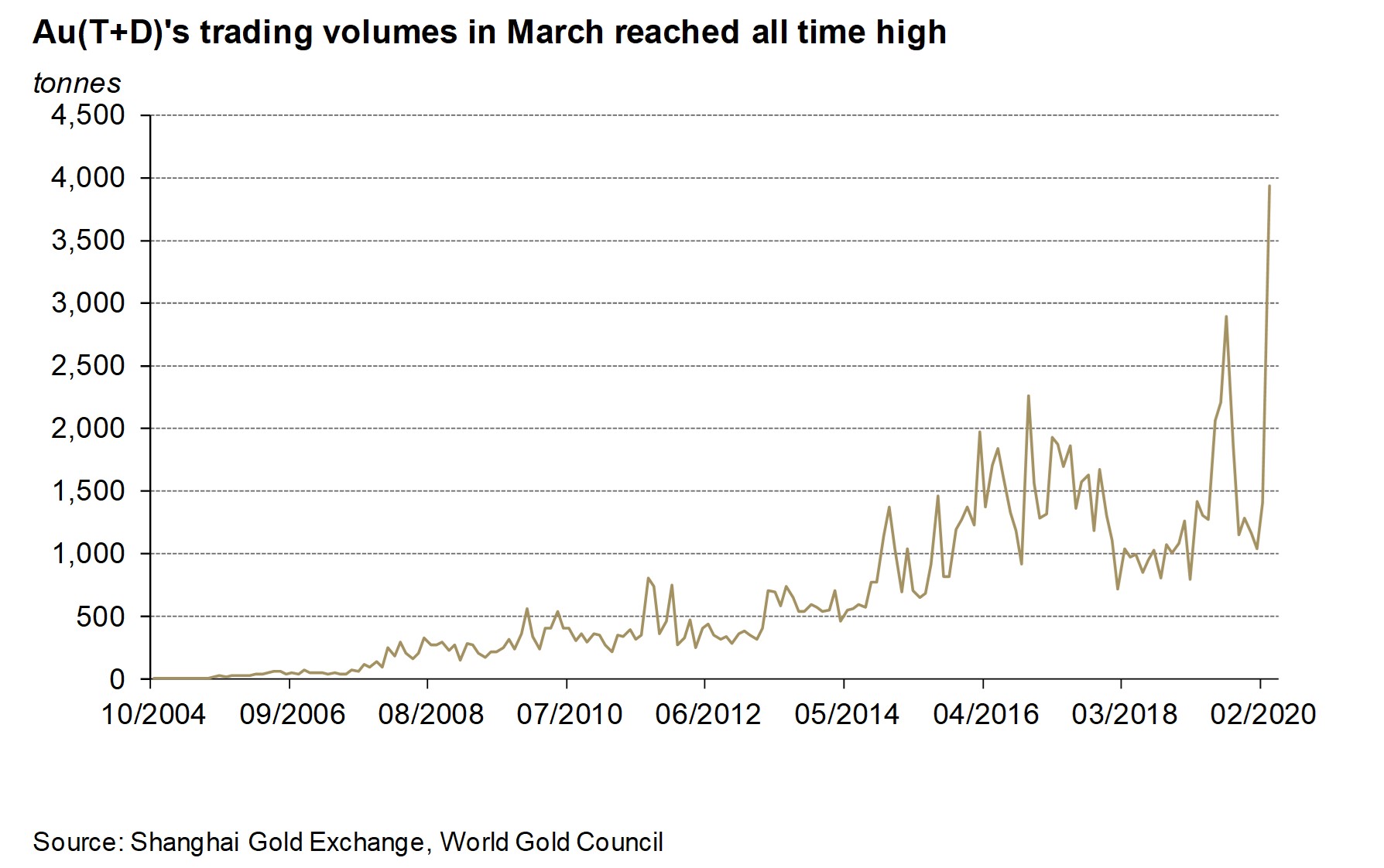 Au(T+D)’s trading volumes in March set a new record, reaching 3,935t. Au(T+D)’s trading volumes in March averaged US$9bn per day, its highest ever level. Safe-haven demand amid sell-offs in Chinese stock and commodity markets following COVID-19 outbreak globally was the main contributor fueling the rocketing Au(T+D)’s trading volumes.