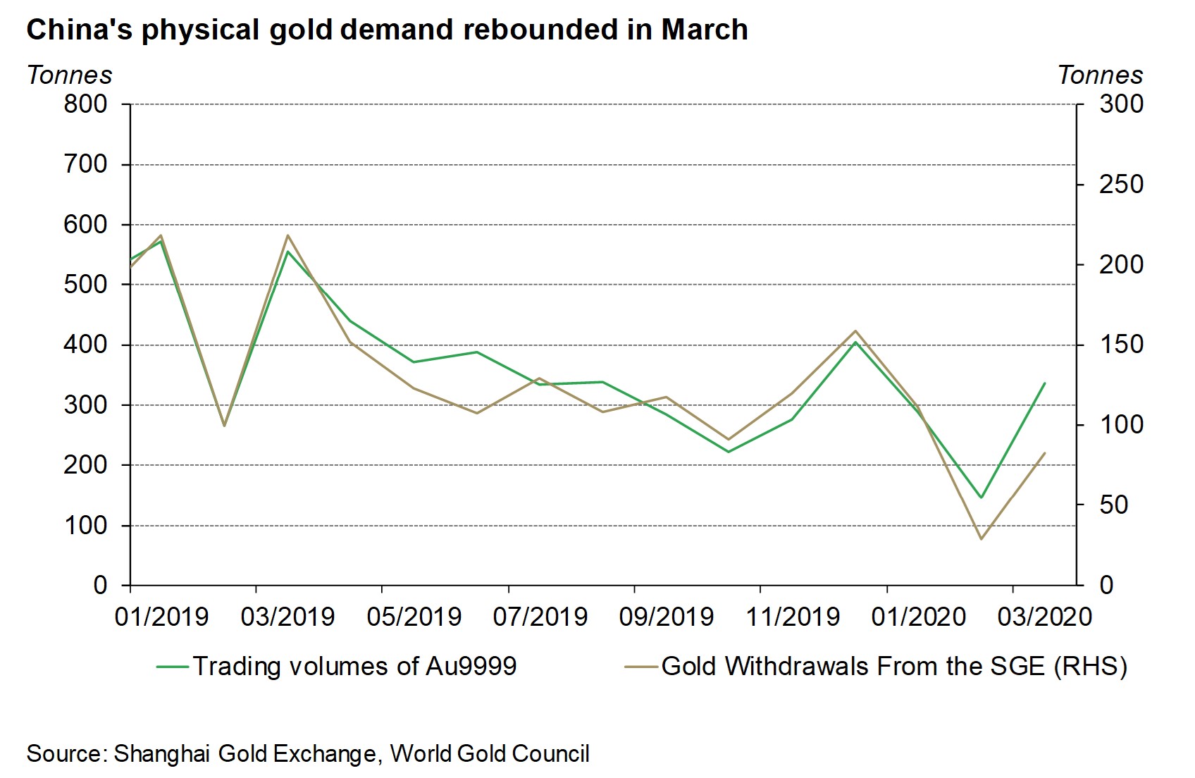 - Au9999’s trading volumes – usually seen as a proxy for physical gold demand in general – and gold withdrawals from Shanghai Gold Exchange (SGE) both saw notable rebounds in March as most Chinese companies resumed operations3