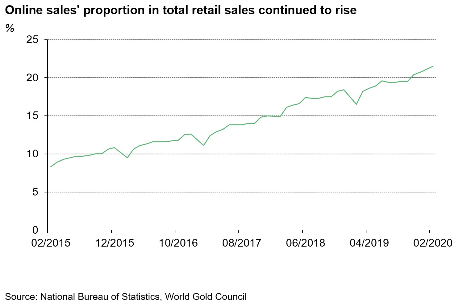 While nearly all sectors in China’s economy were hampered by COVID-19 outbreak, online consumption bucked the trend. As making purchases online and waiting for deliveries are becoming many Chinese people’s daily routine, online sales’ in January and February grew by 3% y-o-y, in contrast to the 21% fall in total retail sales.5 Online channel’s importance is also rising, accounting for 22% of total retail sales as of February.