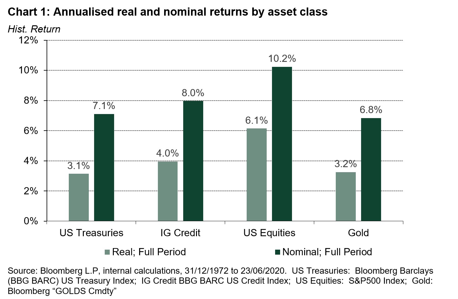 When viewed over long periods, gold’s performance with respect to capital preservation is quite similar to governments. As illustrated in Chart 1, both gold and US Treasuries achieved positive real returns of around three percent on an annualised basis over the last half century.