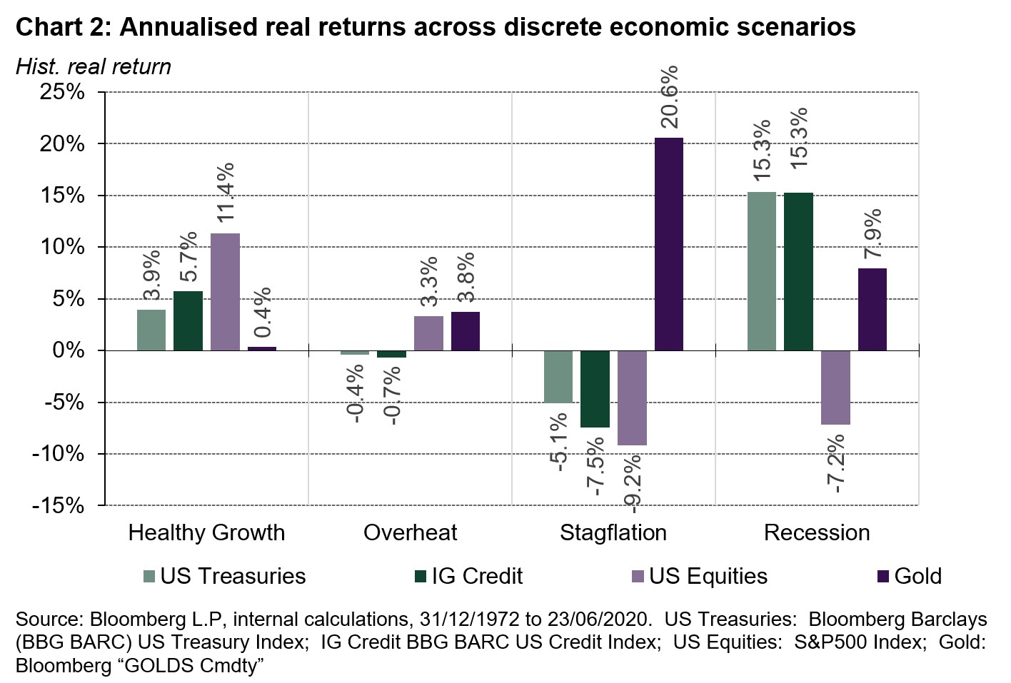 The story is quite different, however, when assessing capital preservation and returns over discrete economic scenarios over the multiple business cycles over the last half century. In comparing gold with traditional reserve assets—mainly US Treasuries—gold performed better in meeting capital preservation objectives during periods of stagflation. During such periods, fixed income returns were eroded by inflation, and equity returns by low economic growth.