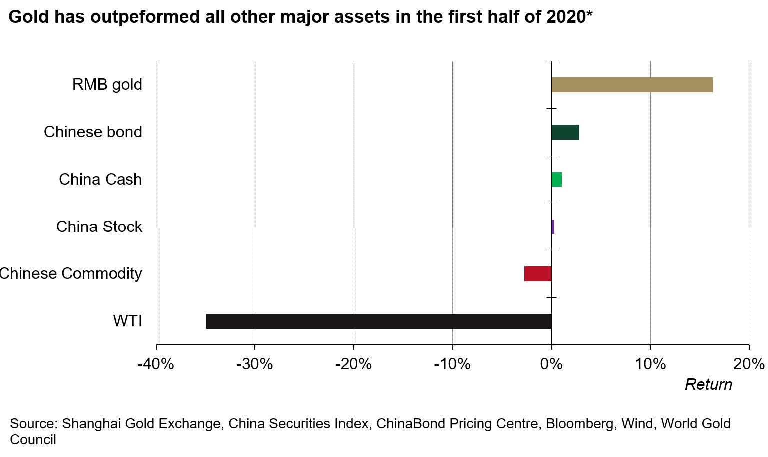 The COVID-19 outbreak has had an unprecedented negative impact on the Chinese economy. City lockdowns and strict travel restrictions to contain the pandemic have led to suspensions in most Chinese industries for the majority of Q1. As a result, China’s GDP in Q1 contracted by 6.8%, the largest drop on record. This unforeseen economic contraction worsened many investors’ already gloomy outlook for China’s growth, lifting their demand for safe-haven assets such as gold. Consequently, gold has outperformed all major Chinese asset classes in the first half of 2020.