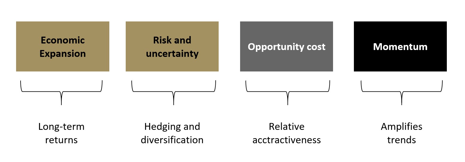 To examine the potential impact of an economic recovery, we first need to revisit the four drivers of gold demand. Namely: