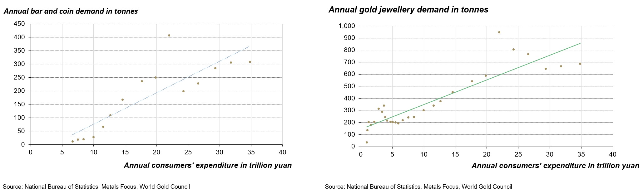 China’s gold jewellery and bar and coin demand are positively correlated to consumer expenditure