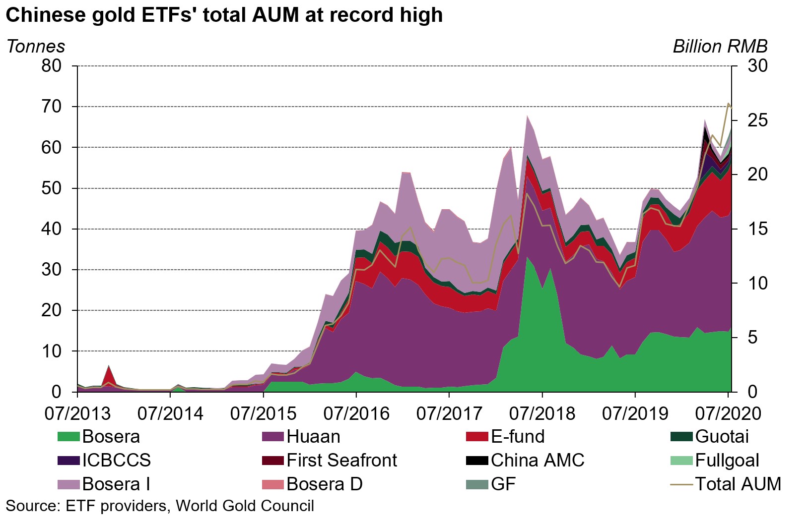 - Chinese gold-backed ETFs’ total asset under management (AUM) recorded another historical high in July