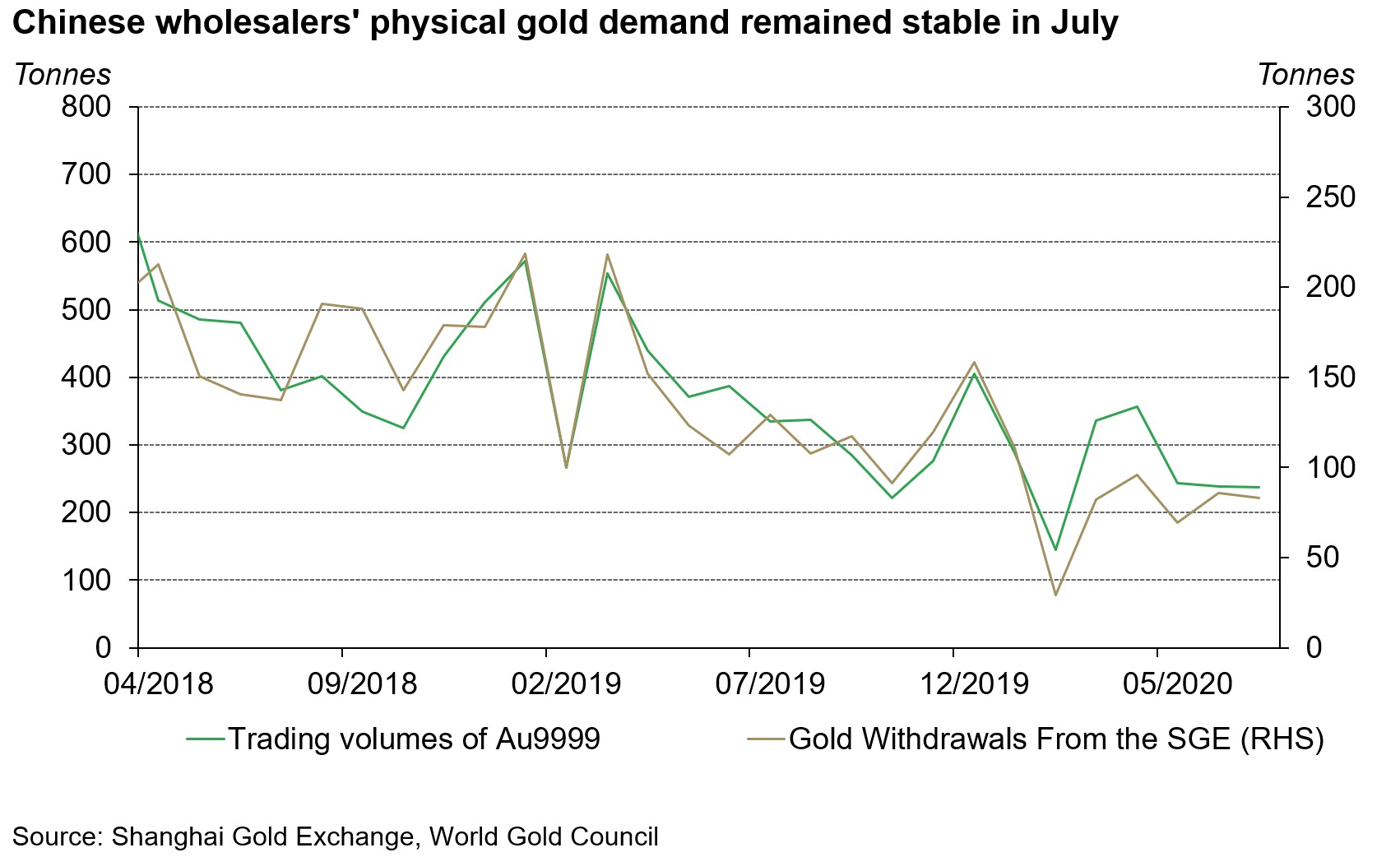 - Both the amount of gold withdrawn from the Shanghai Gold Exchange (SGE) and Au9999’s trading volumes stabilised in July