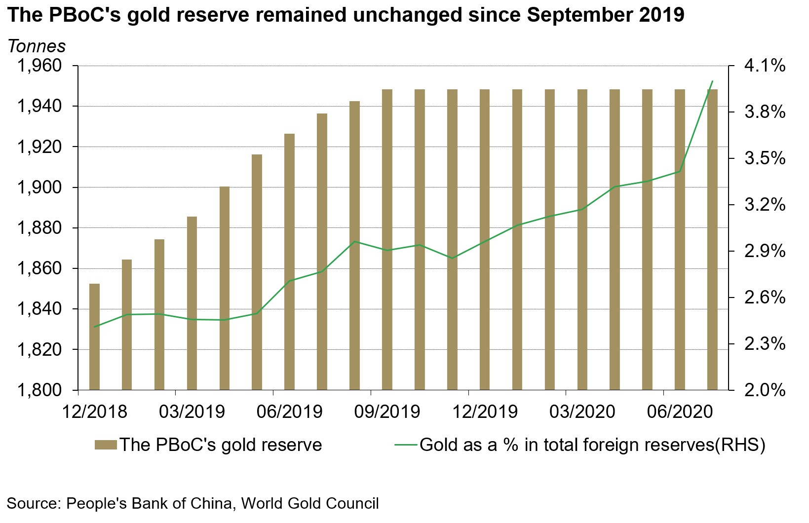The PBoC’s foreign reserves totalled US$3,154.4bn as of July, up by US$42.1bn m-o-m, according to the State Administration of Foreign Exchange (SAFE). The PBoC’s gold reserve has remained unchanged at 1,948t since September 2019 and currently makes up 3.7% of total reserves.