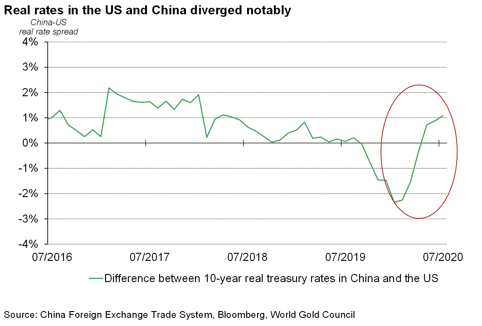 Meanwhile, the relatively different monetary policy environments accelerated local gold price discount’s widening. As a vital driver for local gold prices, China’s real rate has risen in recent months as China’s economy has rebounded and the PBoC became more prudent in supporting liquidity, increasing Chinese investors’ opportunity cost to hold gold.6 As stated in July’s Political Bureau Meeting, while the nation will keep liquidity reasonably ample, the monetary policy should be prudent and neither “too tight nor too loose”.7 In contrast, real rates in the US and Europe witnessed sharp declines and remained negative in the month, significantly reducing Western investors’ opportunity cost to hold gold.