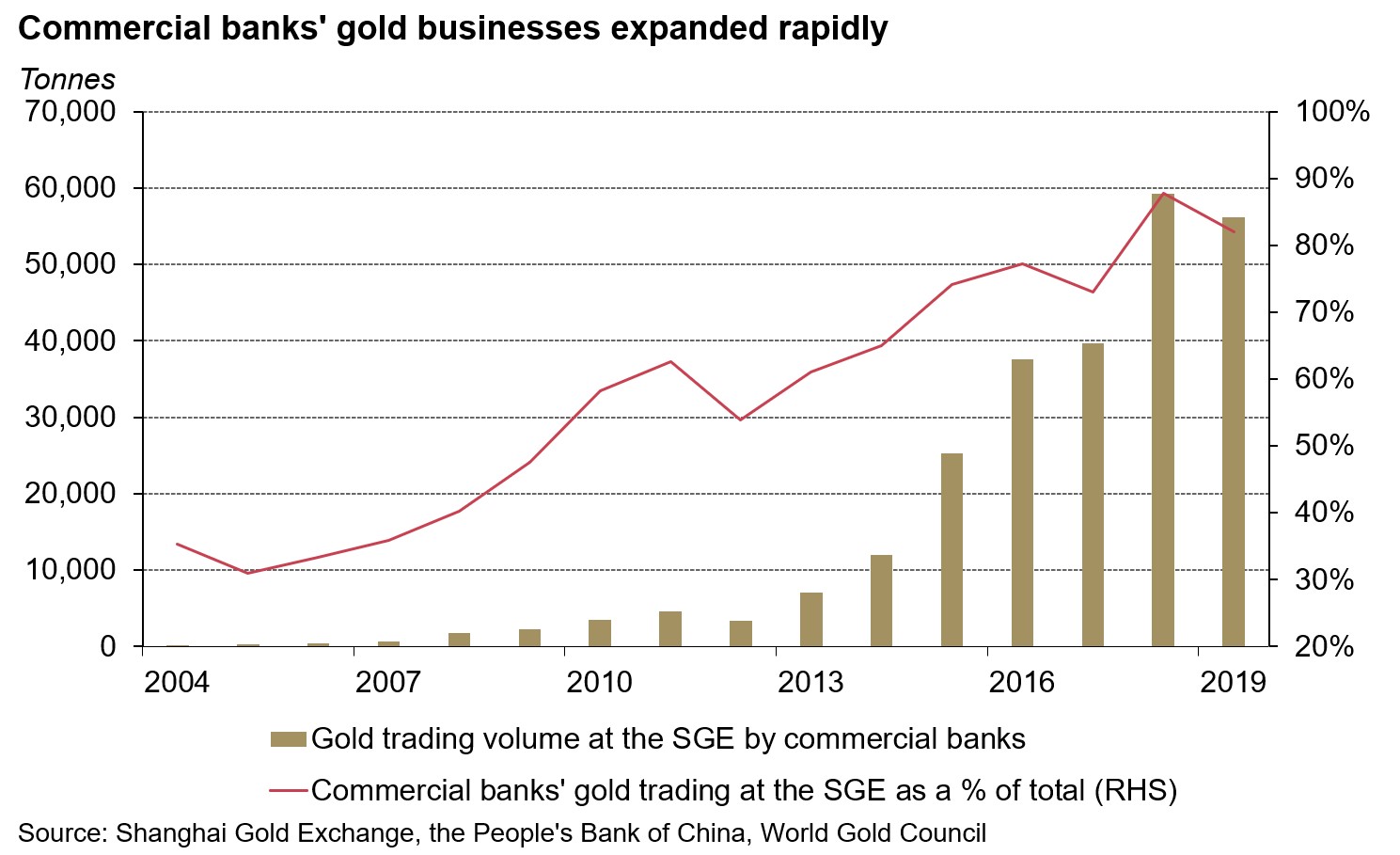 Chinese commercial banks’ gold businesses have expanded rapidly since the PBoC lifted the ban on retail bullion trading at the end of 2003. The following year, their gold trading volumes at the SGE totaled 235t, accounting for 35% of the SGE’s total gold trading volumes. Fifteen years later, gold trading volumes reached 56,202t in 2019, representing 82% of the SGE’s annual total.
