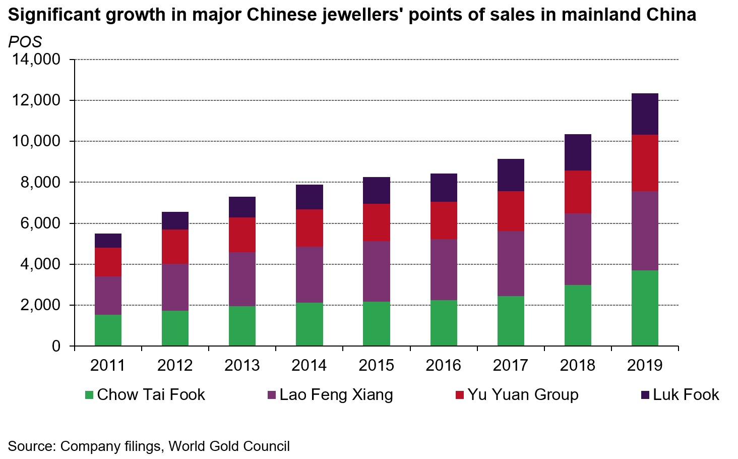 2 In 2019, Chow Tai Seng emerged as the largest listed Chinese jeweller with a total of over 4,000 POS in China. However, it is not included due to its data availability.