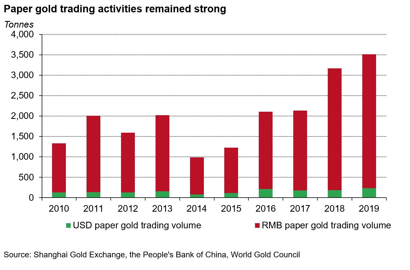 As the gold price gathered momentum and volatility rose during the year, short-term gold investors – who do not have access to the SGE and SHFE’s gold contracts – were active in trading paper gold offered by banks. Such enthusiasm can also be observed from the 60% y-o-y surge in the average 2019 daily trading volumes of Au(T+D), a margin-traded gold contract at the SGE.