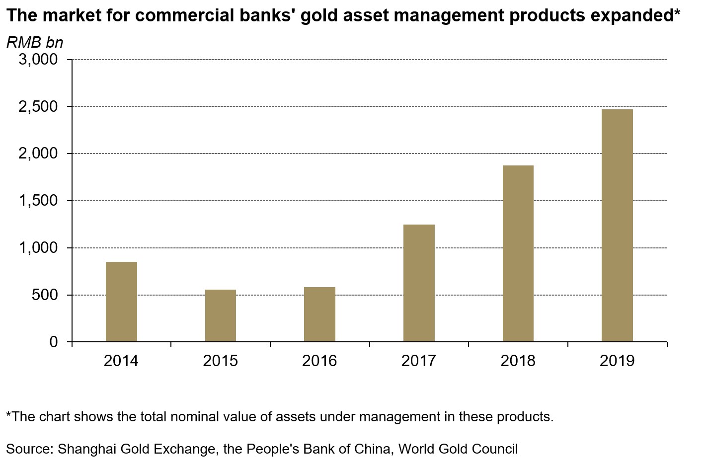 Gold asset management products continued to rise in 2019. That year, the nominal value of gold asset management products issued by commercial banks was RMB2.5trillion, 32% higher y-o-y. This rising gold price attracted many retail investors and encouraged banks to issue more gold-related structured products to fulfill investor demand for exposure to gold.