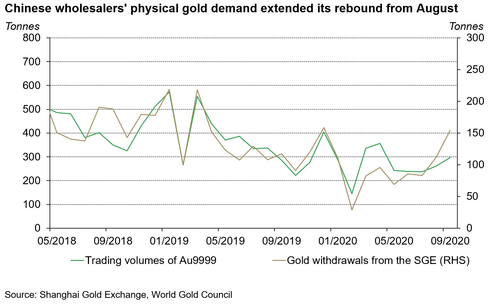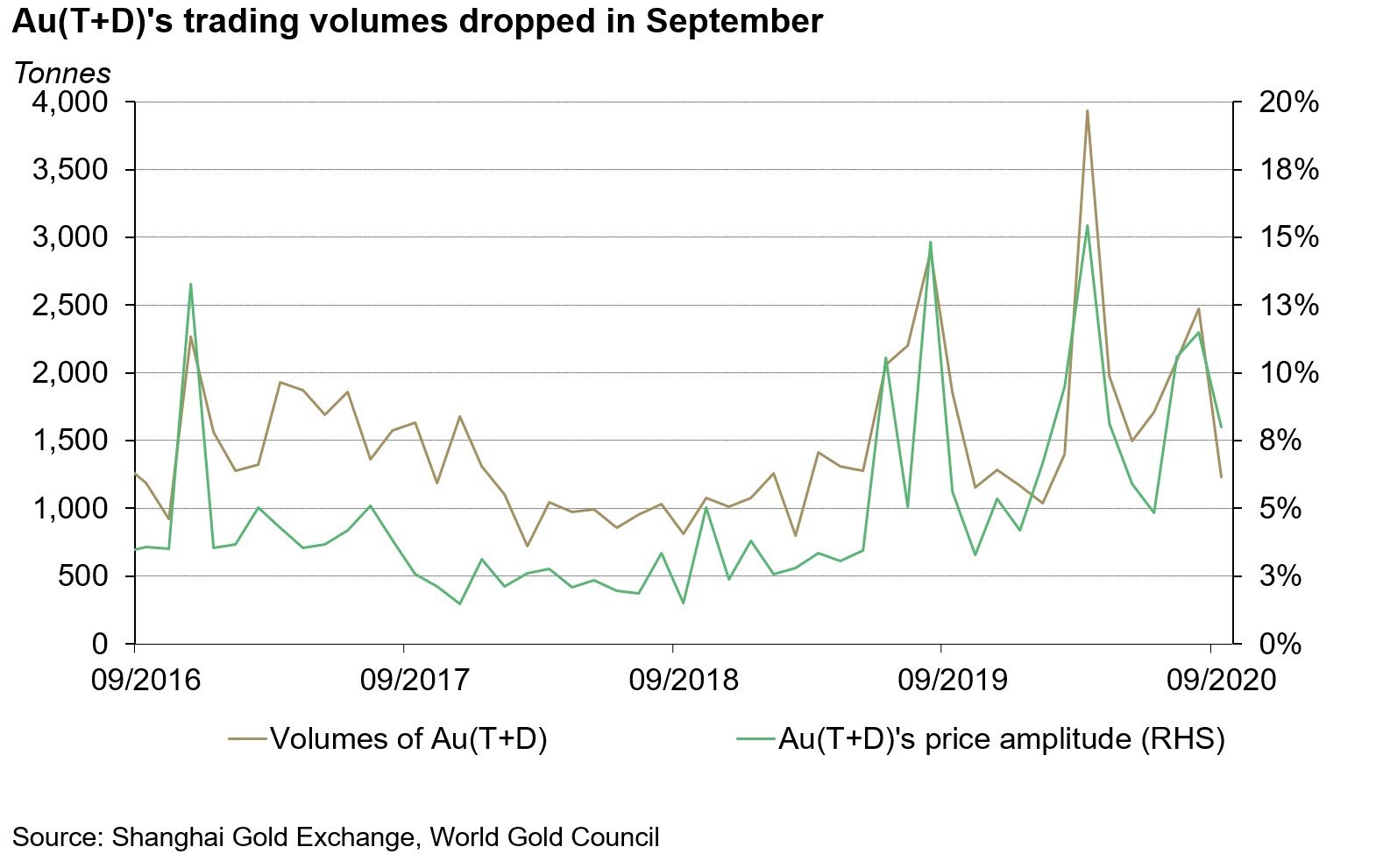 Extending the rebound from August, both withdrawals from the SGE and trading volumes of Au9999 – the physical gold contract at the SGE and a proxy of China’s physical gold demand – rose further. This is due to two key factors. First, as mentioned in my last blog, many jewellery manufacturers and wholesalers held various promotional events in September in conjunction with the Shenzhen Jewellery Fair, attracting retailers from all over the country and boosting sales.