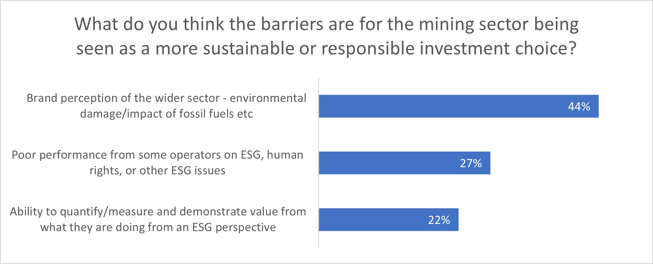 Forty-four percent of webinar participants said the sector has a brand perception problem. While gold mining companies may be making significant investments in stakeholder and community relations, the positive momentum is often lost due to gaps in disclosures, evolving investor expectations and heterogeneous nature of the sector. A big challenge for companies is that most investors and ESG ratings agencies consider mining to be one homogenous industry — often not distinguishing between thermal coal and gold, for example. This means that poor performance from one operator can have ramifications throughout the sector, regardless of commodity.