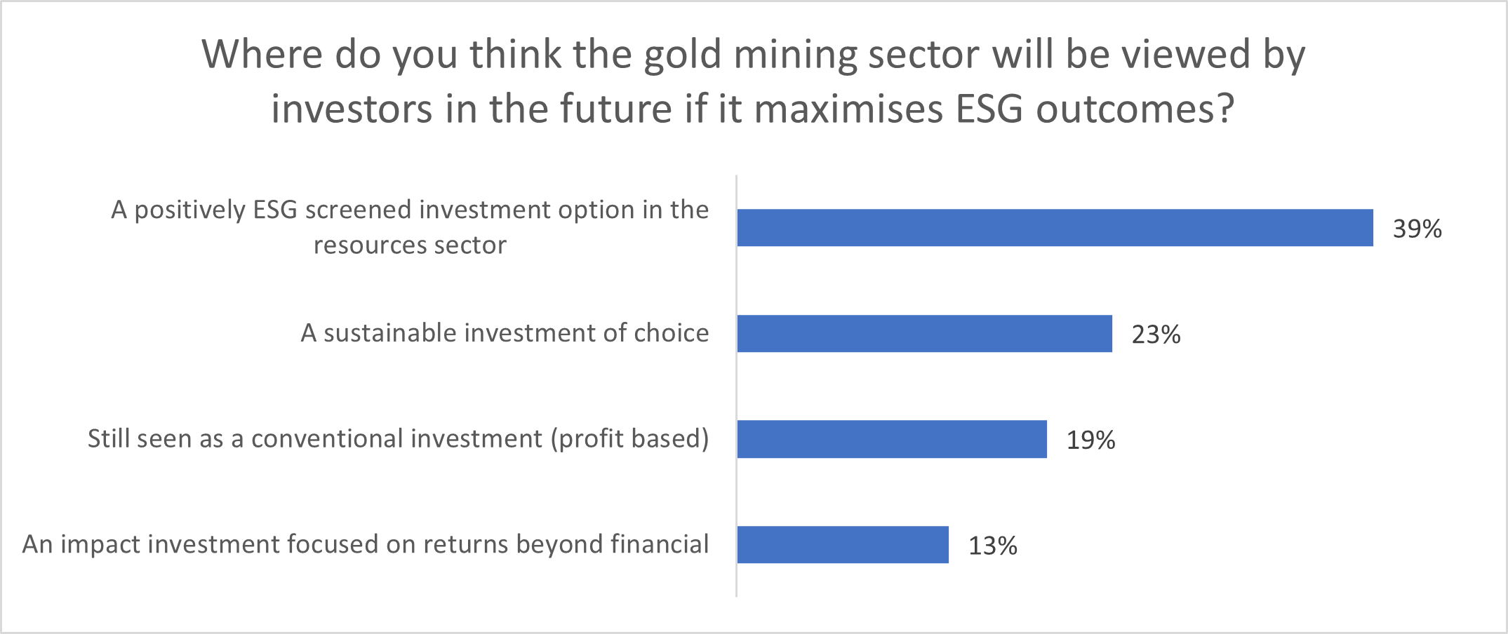 We asked participants how far they thought the gold sector could go. The result was encouraging, with almost 40% saying they see the gold sector becoming a positively screened investment option, and a further 25% thinking it could be a sustainable investment of choice. It is clear that the sector needs to continue to evolve a platform to allow gold to distinguish itself.