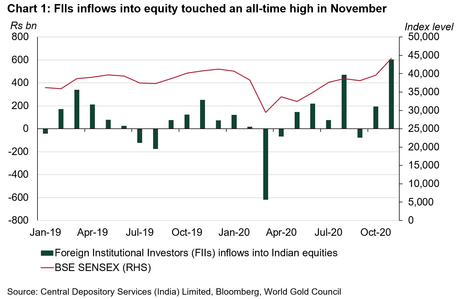 Foreign Institutional Investors (FIIs) inflows into Indian equities have remained strong this year. During the month, FIIs bought equities worth Rs603.6bn (US$8.1bn) – the highest ever net inflows into Indian equities on record. With strong inflows into the stock market, festive demand and optimism around a COVID-19 vaccine, the BSE SENSEX gained 11% during the month (Chart 1).