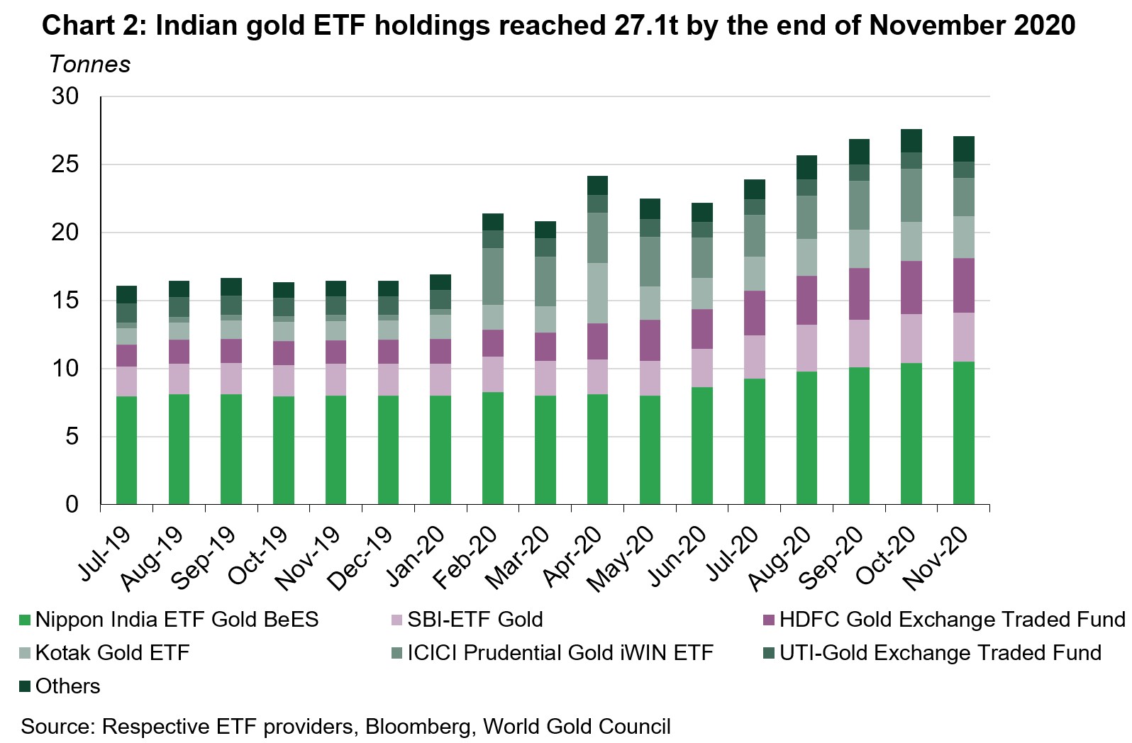 - The strong performance of the equity market, declining COVID-19 cases and a lower domestic gold price contributed to ETF outflows. Total holdings for Indian gold ETFs reached 27.1t at the end of November; a net outflow of 0.5t during the month